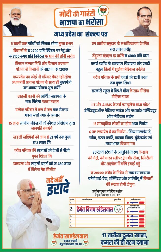 16 नवंबर 2023 भाजपा बैतूल – विधानसभा बैतूल के भाजपा प्रत्याशी हेमंत विजय कुमार खंडेलवाल ने सभी मतदाताओं से 17 नवंबर 2023 को दूसरा खाना कमल का बटन दबा कर भारतीय जनता पार्टी को वोट देने की विनम्र अपील कीहै