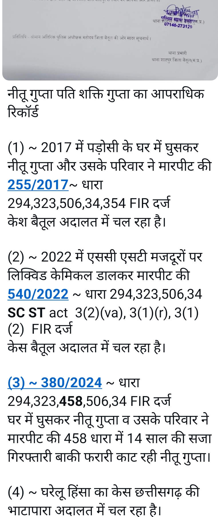 दो दिन पहले शाहपुर की पहली मंडल अध्यक्ष नीतू गुप्ता पर अपराधिक प्रकरण दर्ज होने से बवाल मच गया है। उन पर देवरानी की रिपोर्ट पर शाहपुर थाने में मामला दर्ज है। यह मामला अभी सुर्खियों में ही था कि एक आरटीआई के तहत शाहपुर थाने से निकाली गई एक जानकारी सामने आई है। इसमें उन पर तीन मामले दर्ज होने की बात उजागर हुई है। वर्ष 2017 में नीतू गुप्ता और उनके परिवार पर धारा 294,323, 506 का मामला दर्ज होकर न्यायालय में चल रहा है। वर्ष 2022 एससी-एसटी मजदूरों पर लिक्विड कैमिकल डालकर 294,323, 506, 34, एससी/एसटी एक्ट के तहत प्रकरण न्यायालय में लंबित है। वर्ष 2024 में 294,323, 458, 506, 34 के तहत मंडल अध्यक्ष और उनके परिवार पर मामला दर्ज है। एक मामला घरेलू हिंसा का छत्तीसगढ़ की भटापारा की अदालत में चलने की जानकारी सामने आई है, लेकिन इसकी पुष्टि नहीं हो पाई है। इस संबंध में मंडल अध्यक्ष नीतू गुप्ता से चर्चा के लिए उनके मोबाइल 6263940370 पर काल किया, लेकिन उनकी पुत्री ने बैठक का हवाला देकर चर्चा नहीं कराई। वहीं घोड़ाडोंगरी के चोपना मंडल मे भी अंदरूनी नाराजगी है. मंडल के कार्यकर्त्ता नें अपना नाम नहीं छापने की शर्त बताया कि पूरी हवा को ही जानबूझकर मोड़ दिया गया. पुराने मंडल अध्यक्ष के समय भाजपा नें कई परचम क्षेत्र मे लहराये है. फिर भी तबब्जो नहीं देकर पूरा पक्षपात किया गया है.