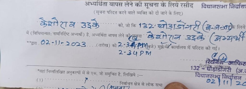 घोड़ाडोंगरी विधानसभा से अभ्यर्थी केसोराव उइके ने अपना नामांकन वापस लिया.