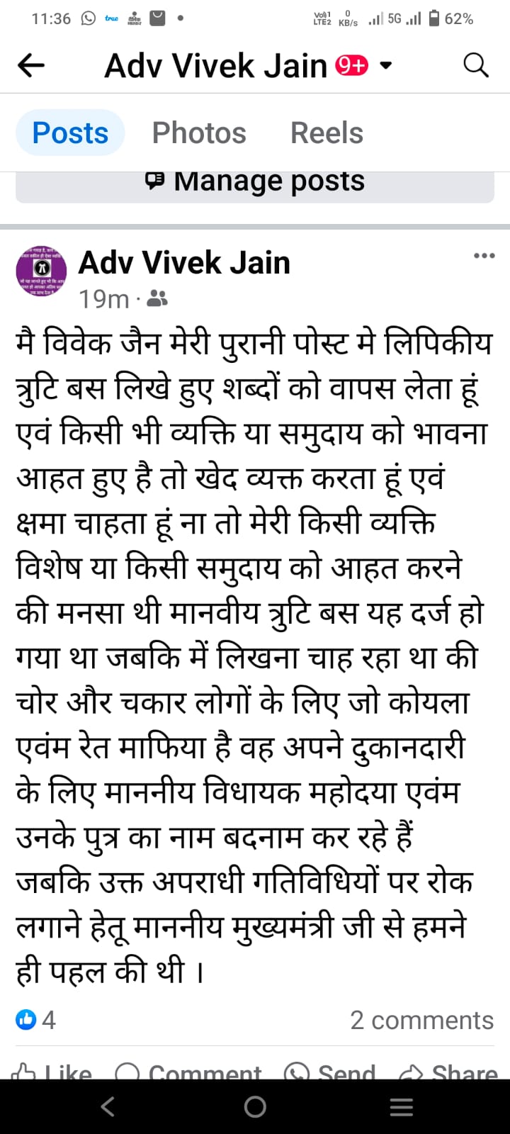 बैतूल 19 मई.  स्वयं के फेसबुक अकाउंट  से  की गई एक पोस्ट पर  पोस्ट को लेकर उपजे विवाद मे  फेसबुक पर पोस्ट करने वाले घोड़ाडोंगरी के वकील विवेक जैन नें खेद व्यक्त करते हुए इसे लिपकीय त्रुटि और गलती से पोस्ट हो जाना बताया है जिसका उन्हें खेद है. वे कुछ और लिख रहें थे टाइप कुछ और शब्द हो गया.किसी समुदाय को आहत करना उनका मकसद बिल्कुल भी नहीं था. उन्होंने कहा की वे जैन है वे ऐसा जानबूझकर सपने भी नहीं कर सकते और अच्छे इंसान का परिचय देते हुए बकायदा क्षमा मांगी है. और यह आग्रह किया है की इस मामले को पूर्णतः यही खत्म माना जावे.