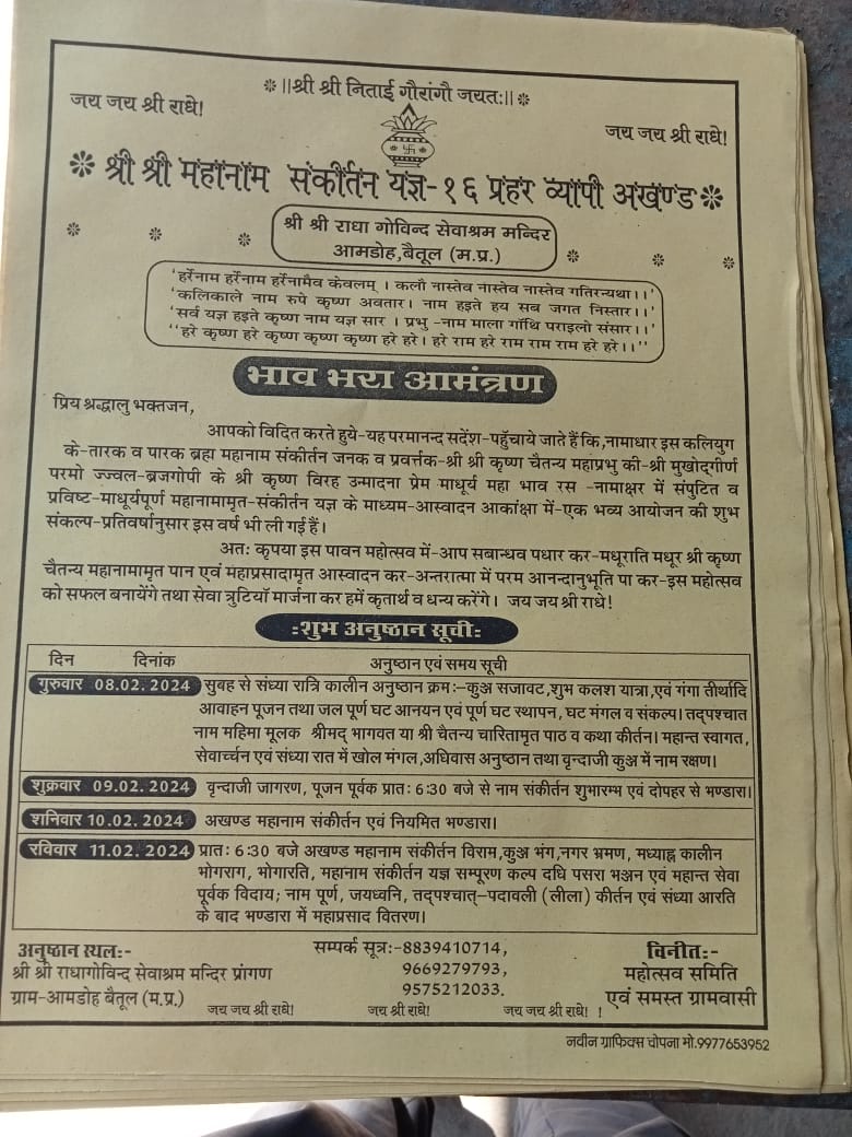 चोपना ग्राम आमडोह बैतूल में 8 फरवरी से श्रीश्री महानाम संकीर्तन यज्ञ एवं 16 प्रहरव्यापी अखंड का आयोजन किया जा रहा है. यज्ञ के आयोजन को लेकर तैयारियां लगभग पूरी हो चुकी है. महोत्सव समिति एवं समस्त ग्रामवासी की ओर से श्रीश्री राधागोविंद सेवा आश्रम मंदिर प्रांगण आमाडोह में यज्ञ आयोजित किया जायेगा. यज्ञ के प्रथम दिवस 8 फरवरी को कलश यात्रा, गंगा तीर्थधि आव्हान पूजन, जलपूर्ण घट, अनायन एवं पूर्ण घट स्थापना की जायेगी. यज्ञ के दूसरे दिन 9 फरवरी को वृंद्धाजी जागरण और प्रात: 6.30 बजे कीर्तन का शुभारंभ होगा। दोपहर में भंडारे का आयोजन किया जायेगा. 10 फरवरी को अखंड महानाम संकीर्तन व भंडारा होगा. रविवार 11 फरवरी को प्रात: 6.30 बजे अखंड महानाम संकीर्तन विराम, नगर भ्रमण और महाआरती के बाद प्रसादी के वितरण किया जायेगा. महोत्सव समिति एवं ग्रामीणजनों ने यज्ञ में भाग लेकर पुण्य लाभ लेने की अपील की है.