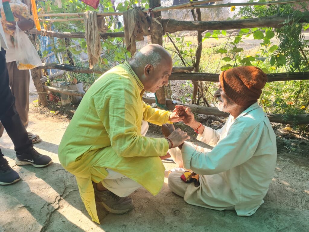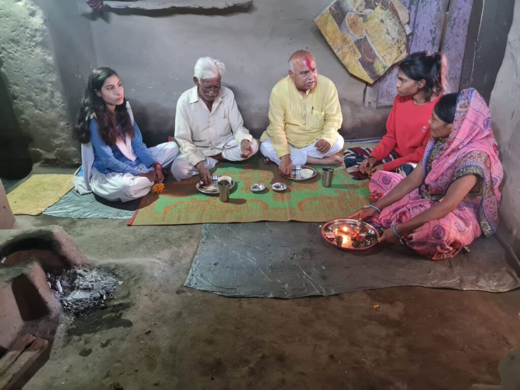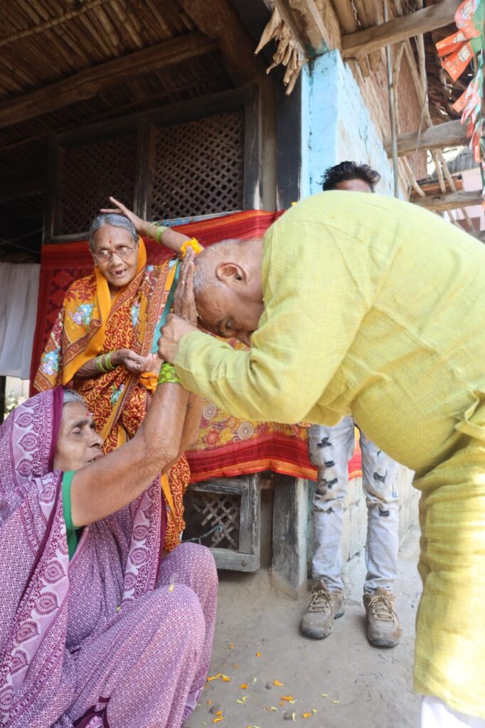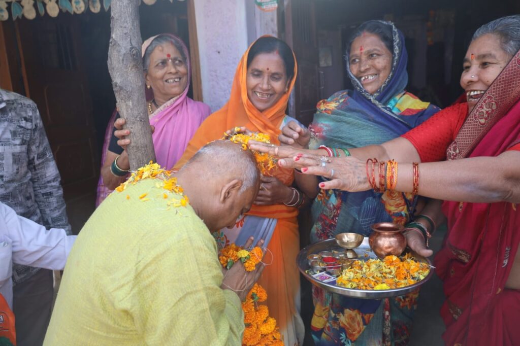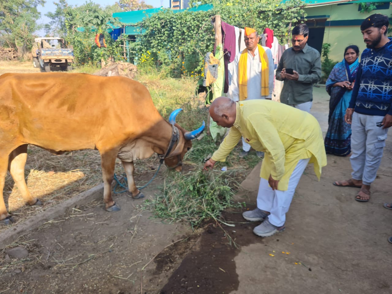 गौसेवा कर शुरू किया जनसंपर्क, वरिष्ठ कार्यकर्ता के आग्रह पर चौके में बैठकर किया भोजन